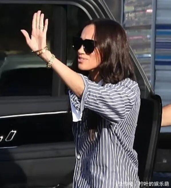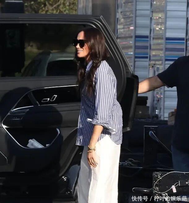 梅根·马克尔在加州帕萨迪纳的电影片场笑容灿烂。她身穿海军蓝条纹衬衫配白色亚麻长裙,脚踩棕色凉鞋,手上戴着标志性的Cartier Love手镯和戴安娜王妃遗留的名表。
